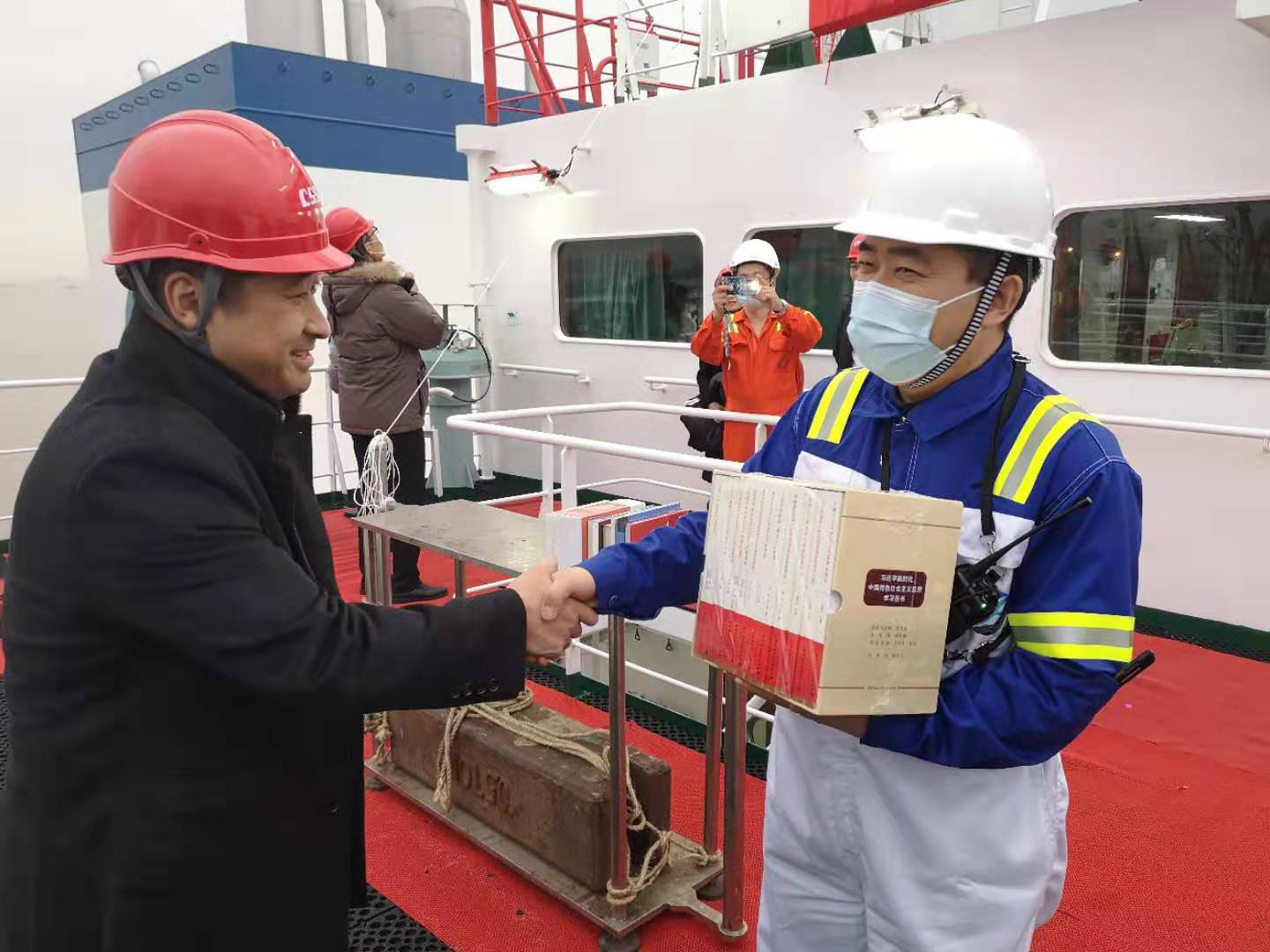 赠书活动结束后,公司党员骨干应邀参加了 “山东德裕”轮命名交船仪式,实地了解船舶建造工艺、基本构造、性能参数等,并就推动党建工作与航运业务、队伍建设融合等问题,与船管公司、船员代表进行了现场交流。下一步,支部还将围绕“三进”主题,深入到船厂车间部门,就加强学习交流、开展党建共建进行实践调研。