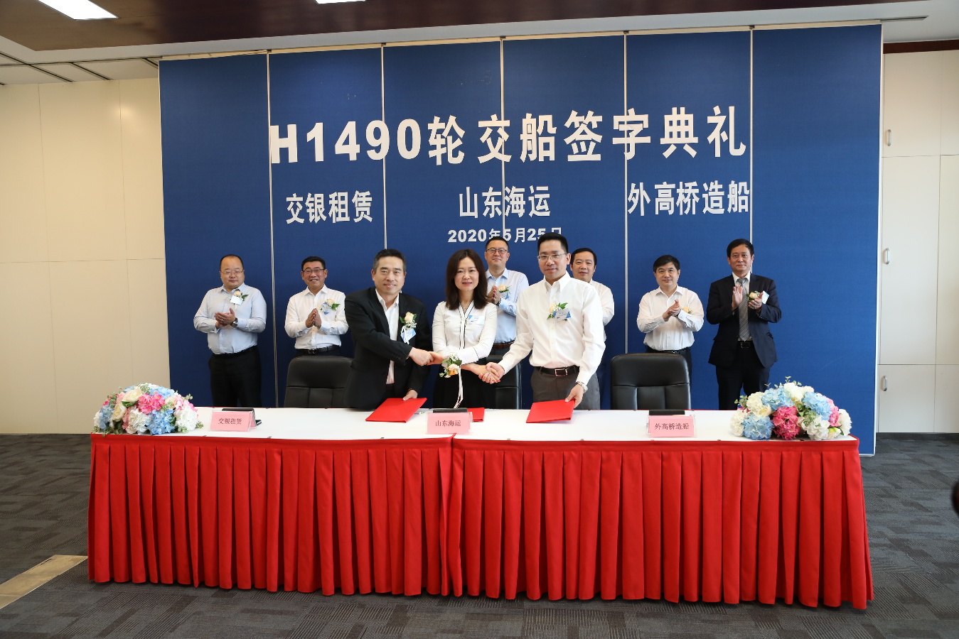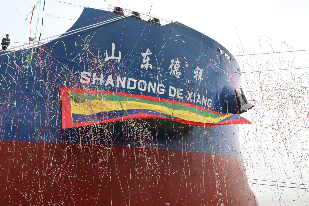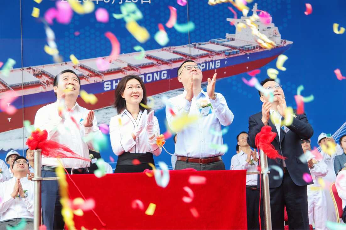 5月25日, 10艘18万载重吨散货船项目首制船“山东德祥”轮命名交船仪式在上海举行。山东海运党委书记、董事长于冰,交银金融租赁有限责任公司副总裁孙磊,上海外高桥造船有限公司总经理陈刚出席仪式并分别致辞,公司董事长顾志伟为该船命名,中国船级社、马绍尔船旗国等合作方代表出席仪式。