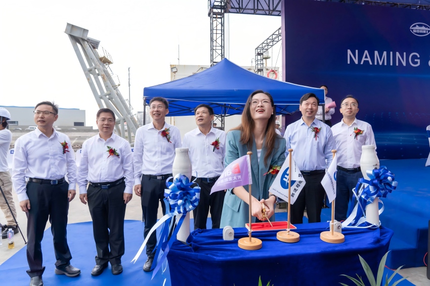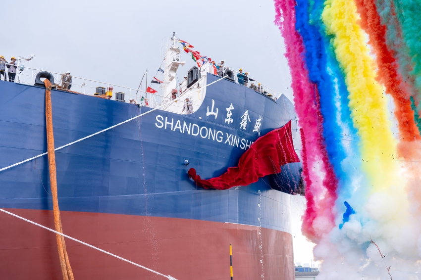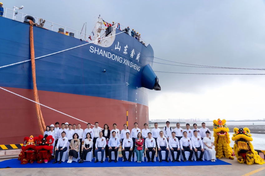 9月27日,由山东海洋集团所属山东海运华宸租赁打造的国内首制应用碳捕集系统散货船“山东鑫盛”轮,在江苏南通景通码头命名交船,标志着华宸租赁12艘8.2万载重吨散货船项目圆满收官。集团公司党委委员、副总经理段银山出席仪式并致辞,省交通运输厅财务处副处长张媛受邀担任教母并为船舶命名砍缆。海洋控股党委副书记、董事、总经理,华宸租赁董事长顾志伟,以及光大金租、韩通集团、中国船级社、上海船舶研究设计院、中船集团第七一一研究所等相关单位领导出席命名交船仪式。
